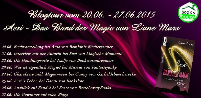 Am Samstag (20. Juni) startet eine weitere Blogtour! "Aeri - Das Band der Magie 1" von Liane Mars wird bis zum 26. Juni vorgestellt, die Gewinner des Blogtour-Gewinnspiels werden am 27. Juni bekannt gegeben. Die Blogtour startet bei Bambinis Bücherzauber und macht dann bei folgenden Blogs Station: Magische Momente, Bookwormdreamers, Fantasiejunky, Garfieldsbuecherecke, booksline und Beatelovelybooks.